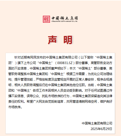 6月29日,针对近期有网民发布的中国稀土(000831)集团有限公司(以下简称“中国稀土集团”)旗下上市公司中国稀土(000831)部分董事、高管职务变动的不实信息,中国稀土集团发布声明称: